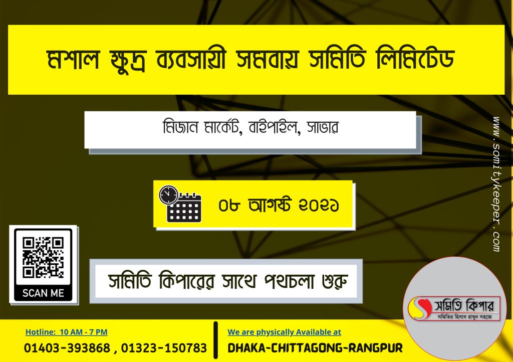 মশাল ক্ষুদ্র ব্যবসায়ী সমবায় সমিতি লিমিটেড, মিজান মার্কেট, বাইপাইল, সাভার। আমাদের সাথে সমিতি কিপার প্রজেক্টে চুক্তিবদ্ধ হয়।