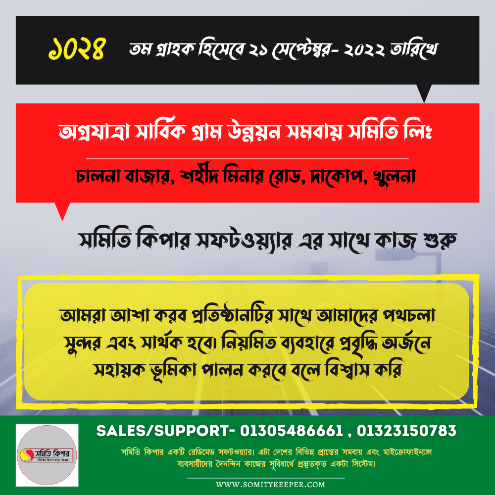 সাম্প্রতিক সমিতিগুলোঅগ্রযাত্রা সার্বিক গ্রাম উন্নয়ন সমবায় সমিতি লিঃ চালনা বাজার, শহীদ মিনার রোড, দাকোপ, খুলনা। আমাদের সাথে সমিতি কিপার প্রজেক্টে চুক্তিবদ্ধ হয়। September 22, 2022