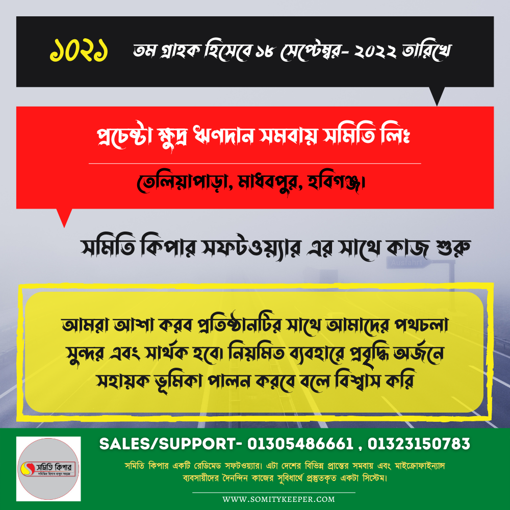 সাম্প্রতিক সমিতিগুলোপ্রথম আলো সঞ্চয় ও ঋনদান সমিতি লিঃ আমাদের সাথে সমিতি কিপার প্রজেক্টে চুক্তিবদ্ধ হয়। প্রতিষ্ঠান এর জন্য শুভকামনা রইলো। September 2, 2022